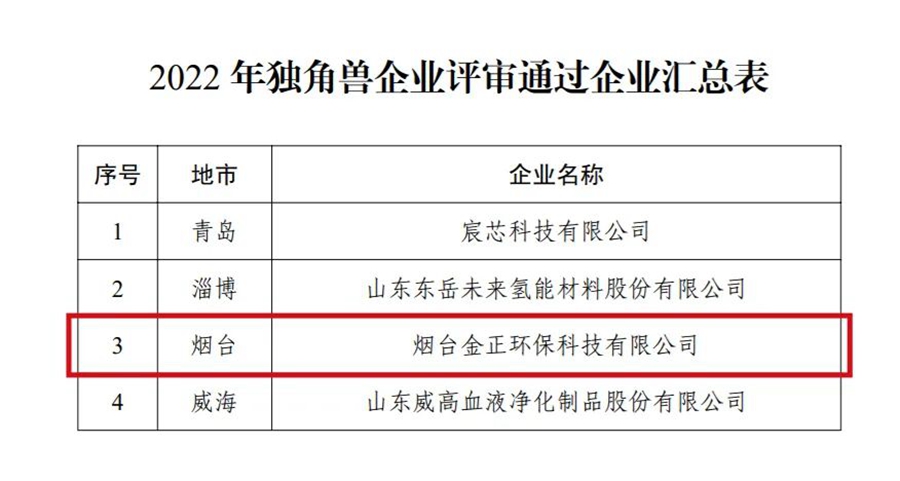 7月19日,山東省工信廳正式公布2022年獨(dú)角獸企業(yè)榜單,煙臺(tái)金正環(huán)保強(qiáng)勢上榜,成為本年度僅有的4家獨(dú)角獸企業(yè)之一。
