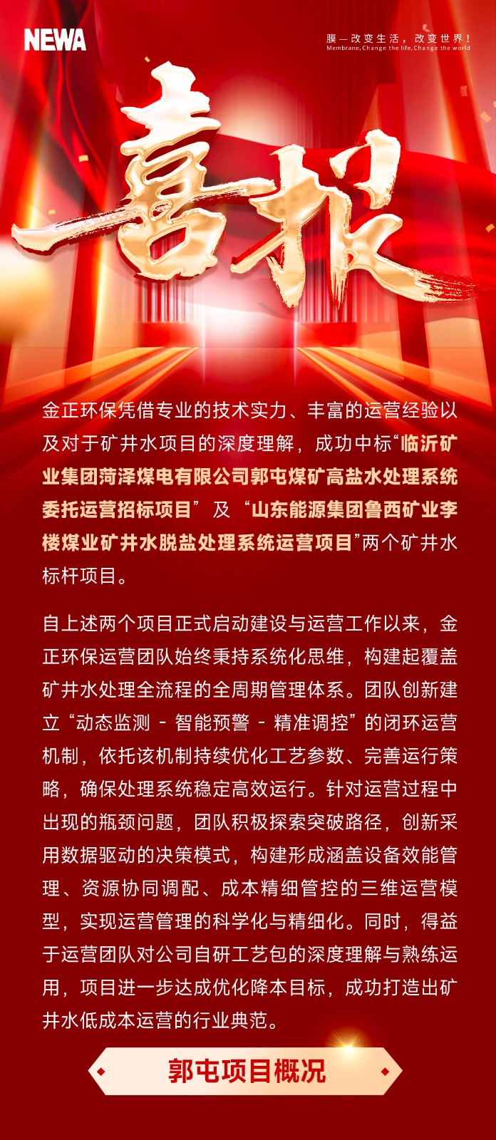 創新突破丨魏墻項目建成投產!“脫穩耦合平板膜工藝包” 打造煤礦礦井水零排放處理“小而強”的項目標桿